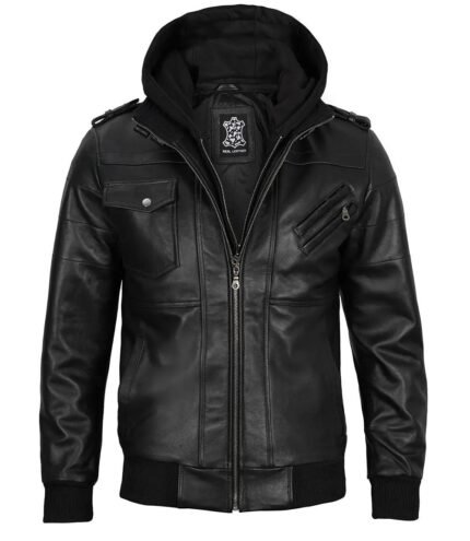 Men`s Black Real Leather Hooded Jackets