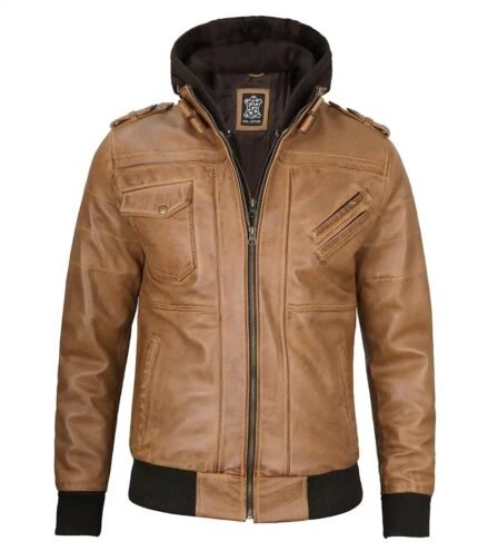 Men`s Brown Sheepskin Leather Hooded Bomber Jackets