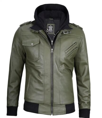 Men`s Green Real Leather Hooded Jackets